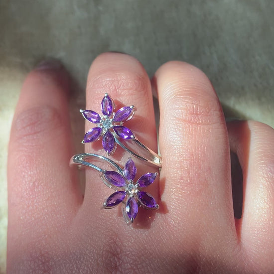 Adorn your fingers with the enchanting beauty of our 925 Sterling Silver Amethyst Floral Ring. Featuring two delicately crafted flowers, this elongated ring is a captivating expression of elegance and sophistication. Set with radiant amethyst gemstones, it adds a touch of charm to any ensemble, making it a must-have accessory for every occasion.