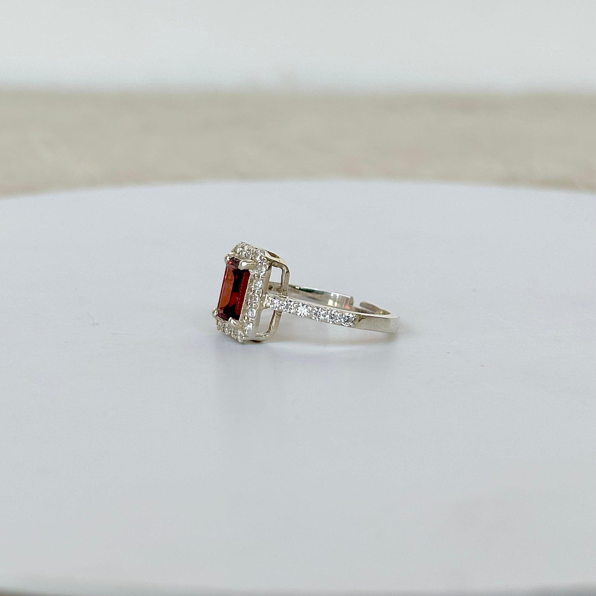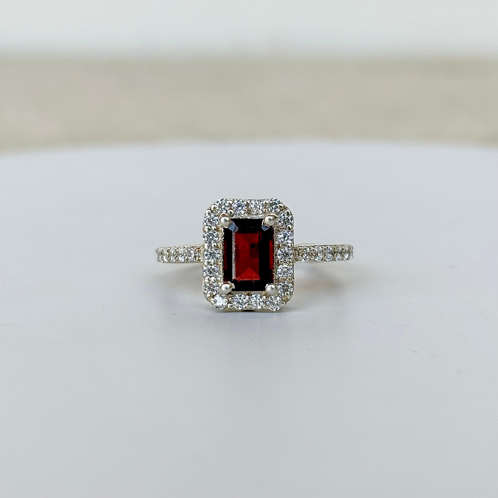 This stunning statement ring features a captivating emerald cut natural Garnet gemstone set in lustrous 925 sterling silver, creating an enchanting piece that radiates elegance and charm.