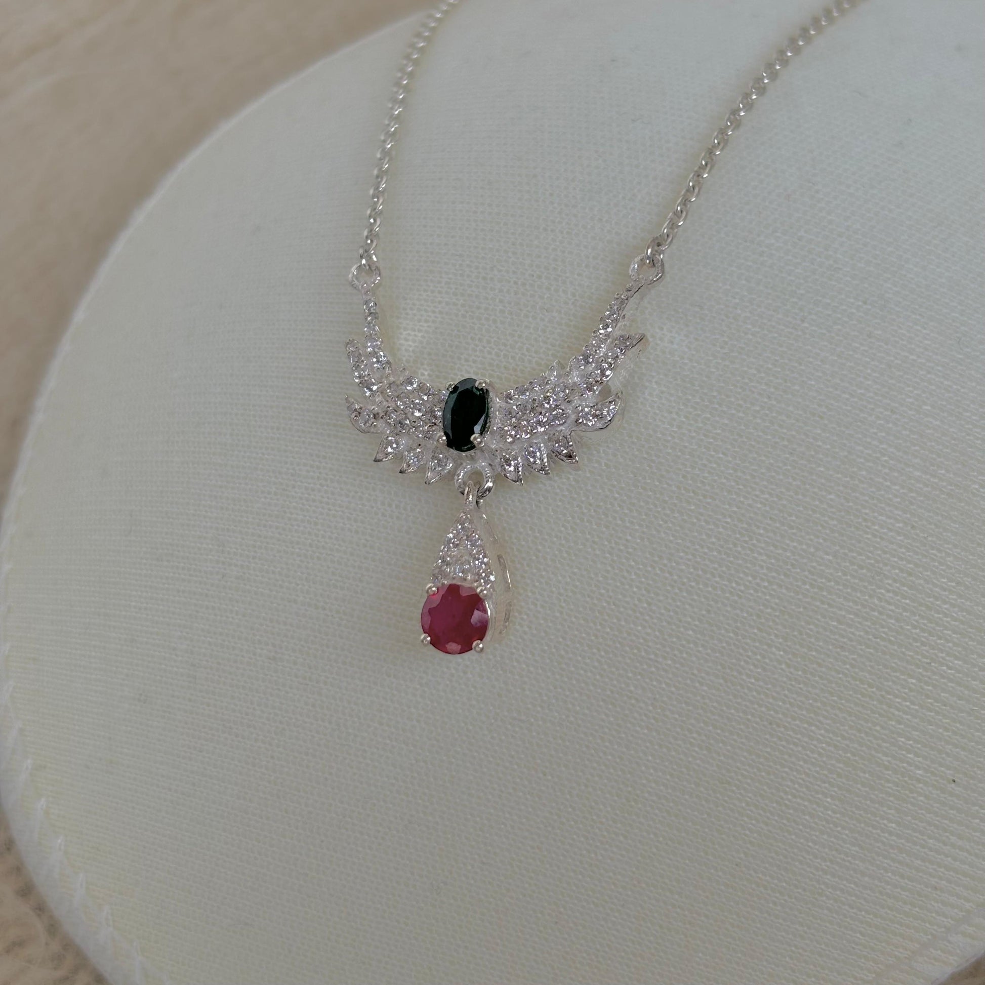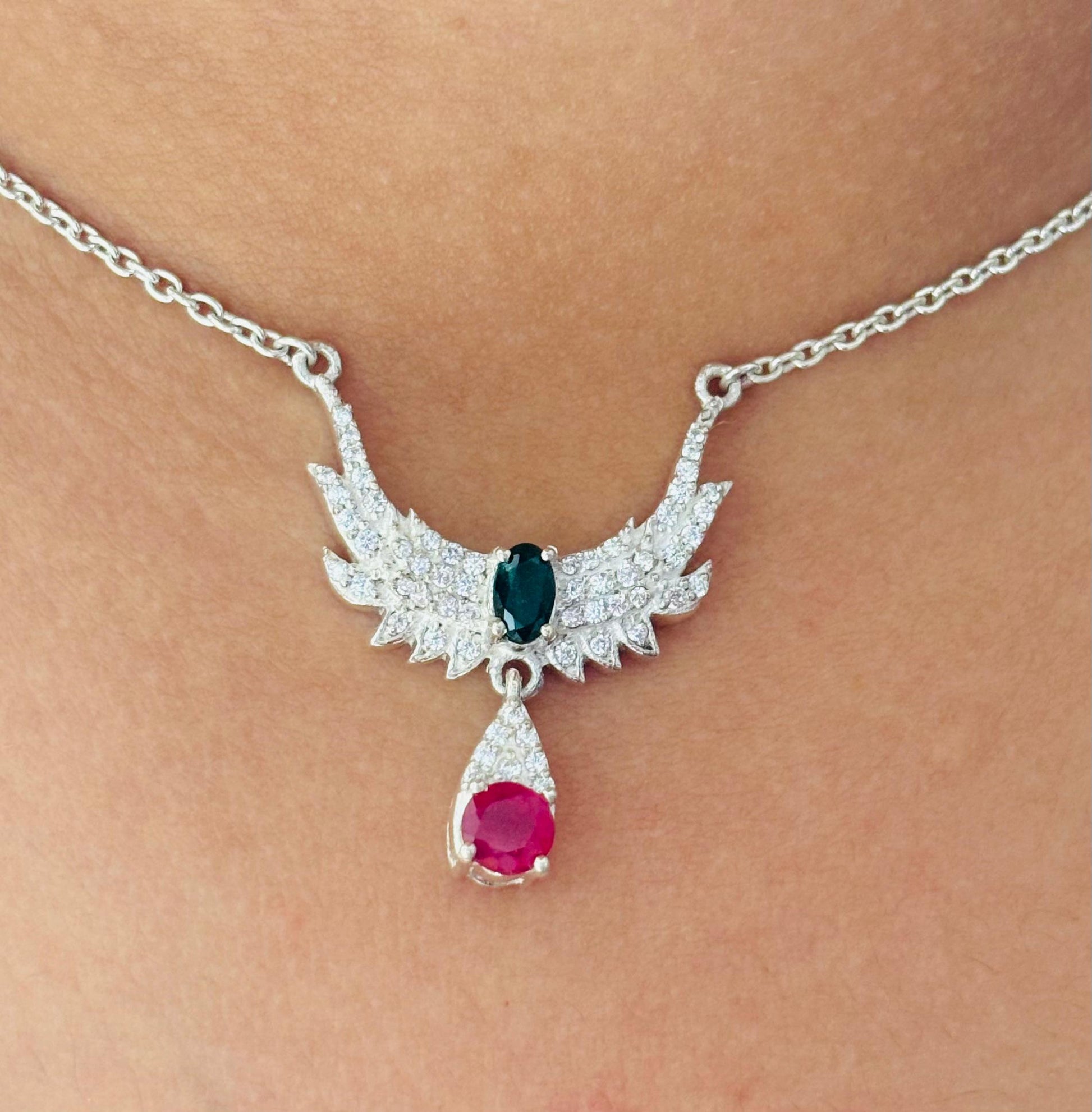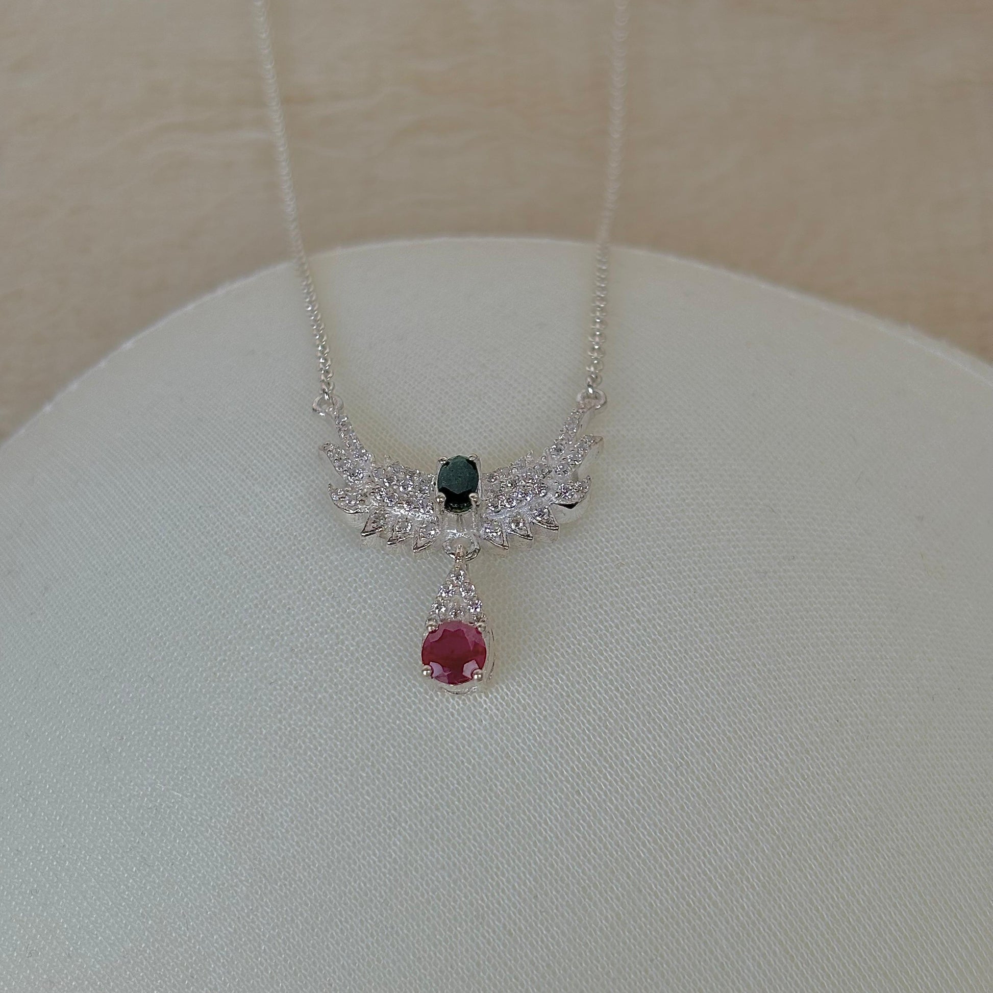 925 elegant silver pendant featuring a wing-inspired design encrusted with shimmering white stones, centered with AAA quality emerald and a daggling ruby adding a pop of color and sophistication.