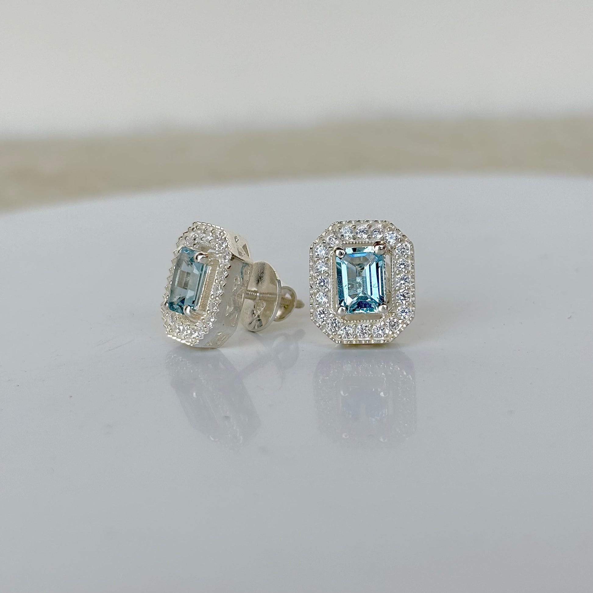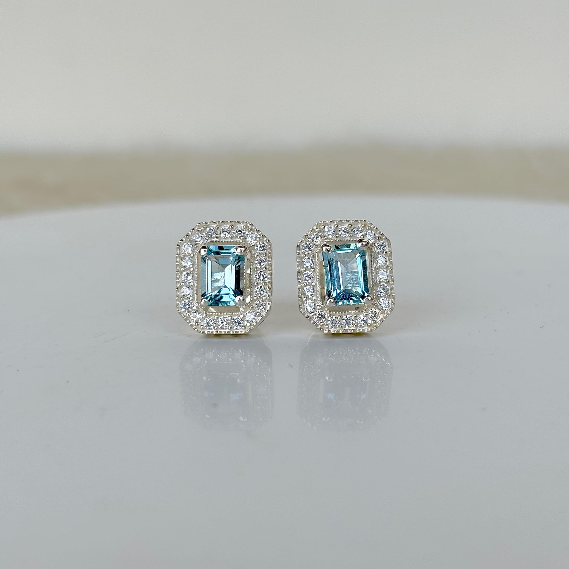 925 sterling silver natural blue topaz halo stud earring radiates elegance with its serene blue hue, symbolizing clarity and calm, combines timeless sophistication with enduring quality.