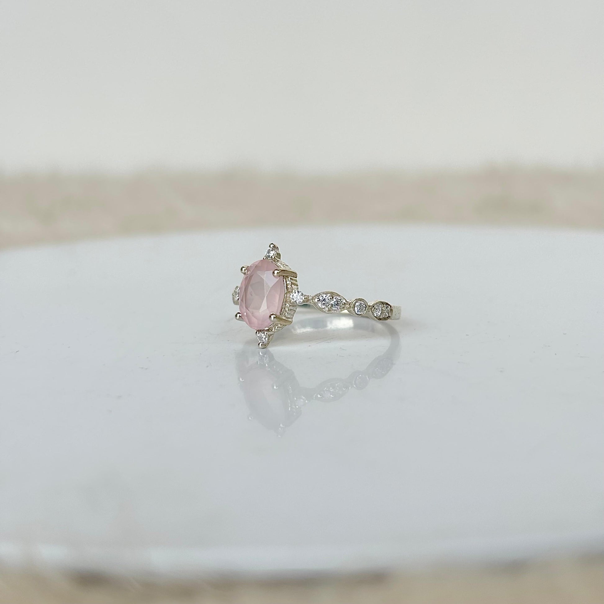 Adorned with a captivating oval-shaped rose quartz, this statement ring exudes elegance and sophistication. The delicate pink hue of the stone radiates warmth and femininity, making it a symbol of love, compassion, and inner peace.