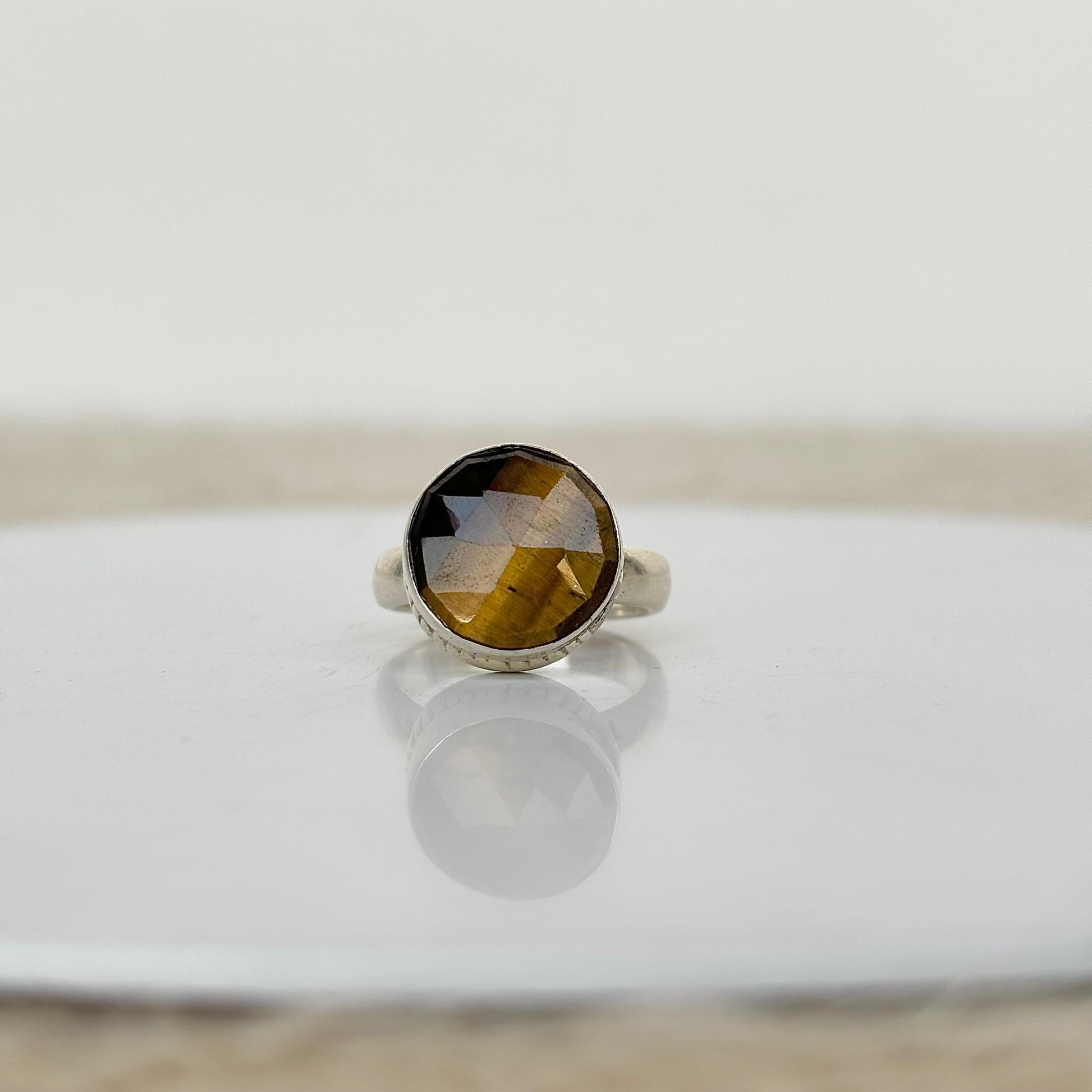 Tiger Eye, revered for its mesmerizing golden-brown hues and captivating shimmer, takes center stage in this timeless piece. Each stone is carefully selected to showcase its unique patterns and natural luster, making every ring a one-of-a-kind treasure.