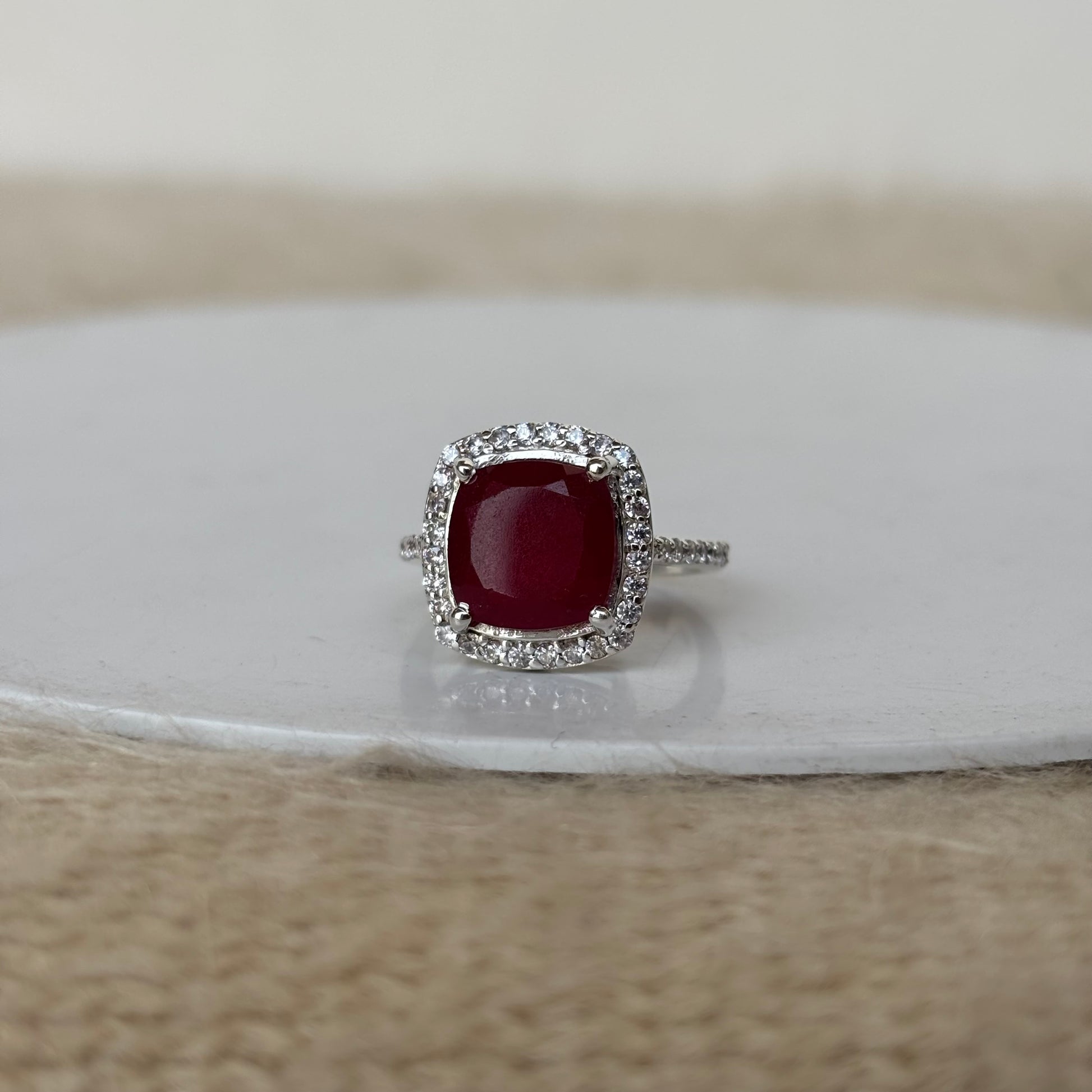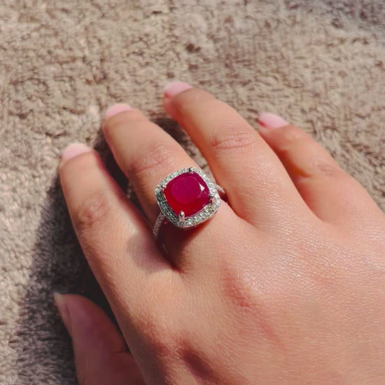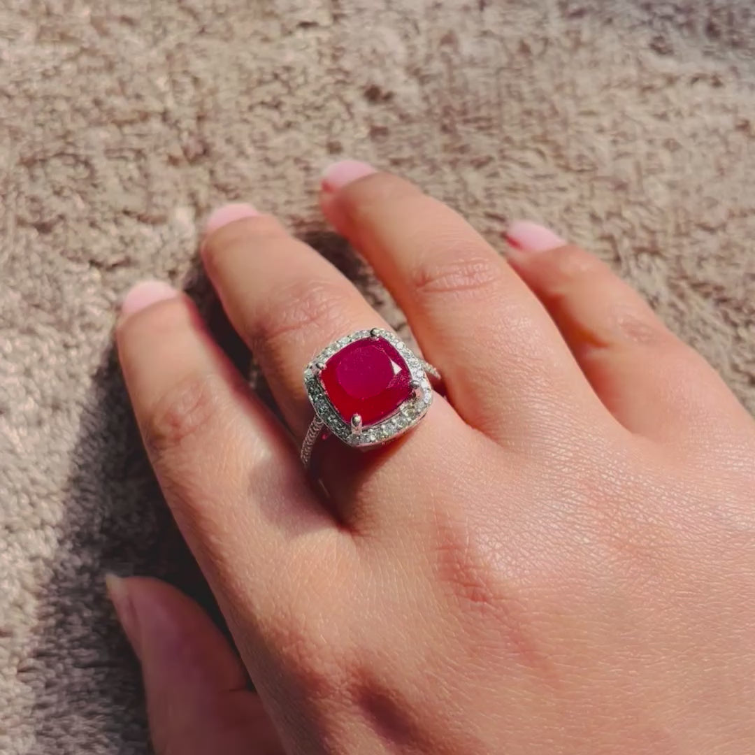 This elegant ruby quartz ring is crafted in pure 925 sterling silver and features a vibrant red quartz gemstone that mimics the rich appearance of natural ruby. The stone is finely cut to reflect light beautifully, offering a brilliant sparkle and luxurious appeal.